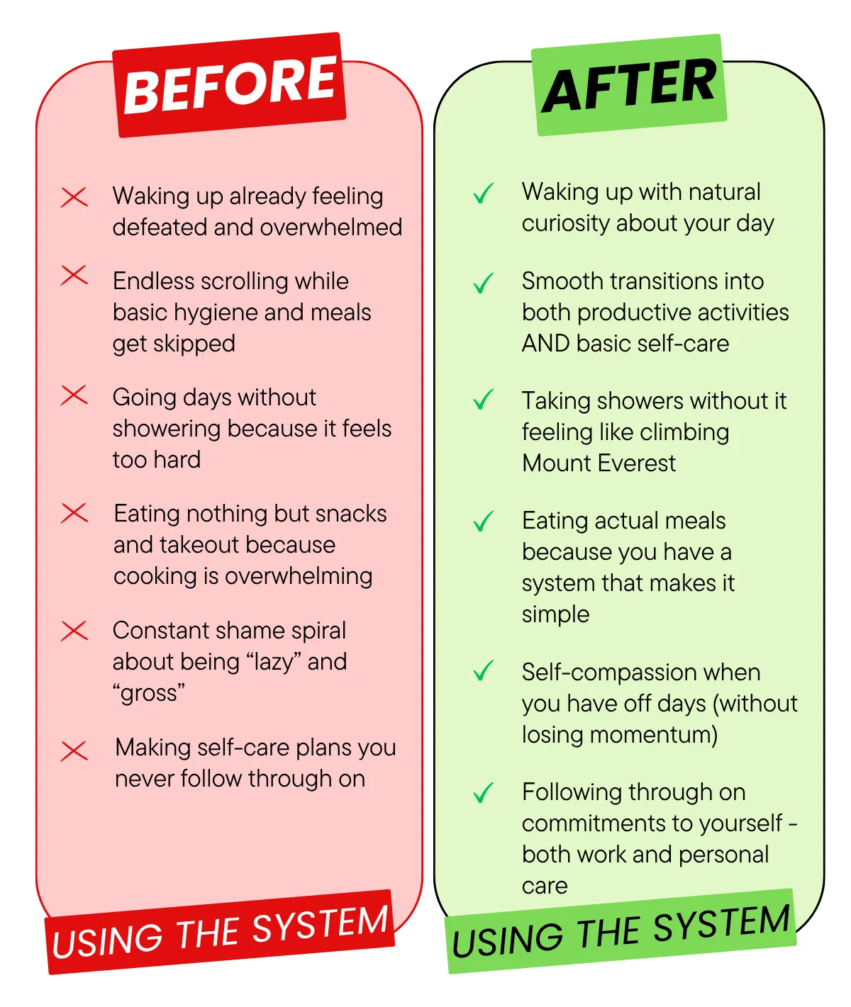 A: Traditional self-care advice often sets you up for failure with unrealistic expectations. Our approach focuses on the absolute basics first - like taking showers and eating real food - before building up to anything elaborate. No bubble baths required.